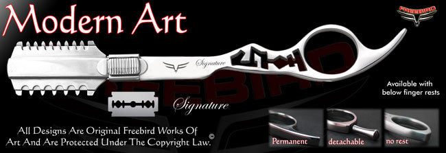 Freebird Shears is the only shear company in the world that lets you build your own professional custom razors from scratch in just a few easy steps. Our Custom razors are hand made one by one according to our customers specifications right here in the U.S.A. out of high quality stainless steel. No plastic parts whatsoever. All of our razors come with a lifetime and a money back guarantee. We stand behind our products 100%. Making flawless precision instruments that reflect who our customers are as professionals, as artists and as human beings is what we are all about.