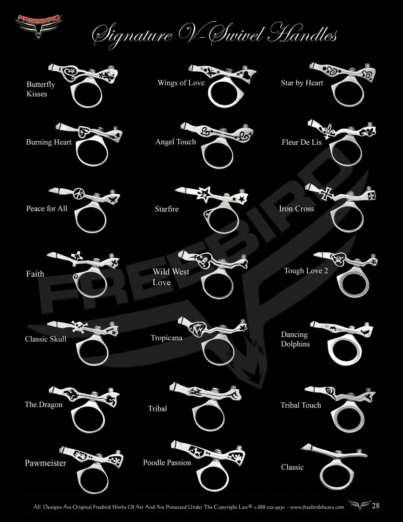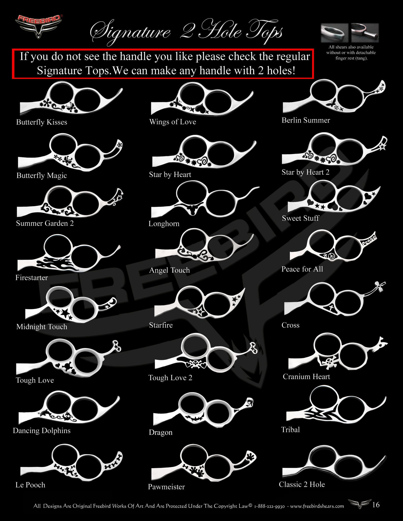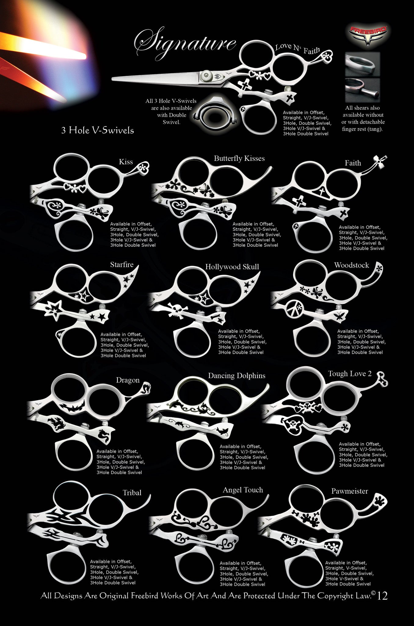 This is a collection of our popular 3 Hole Swivel Shears. Pick from the popular catalog models or mix&match any top and bottom handle at no extra charge. If you do not see the design that you like please browse the Signature offset tops. We can make any top in a 3 hole.