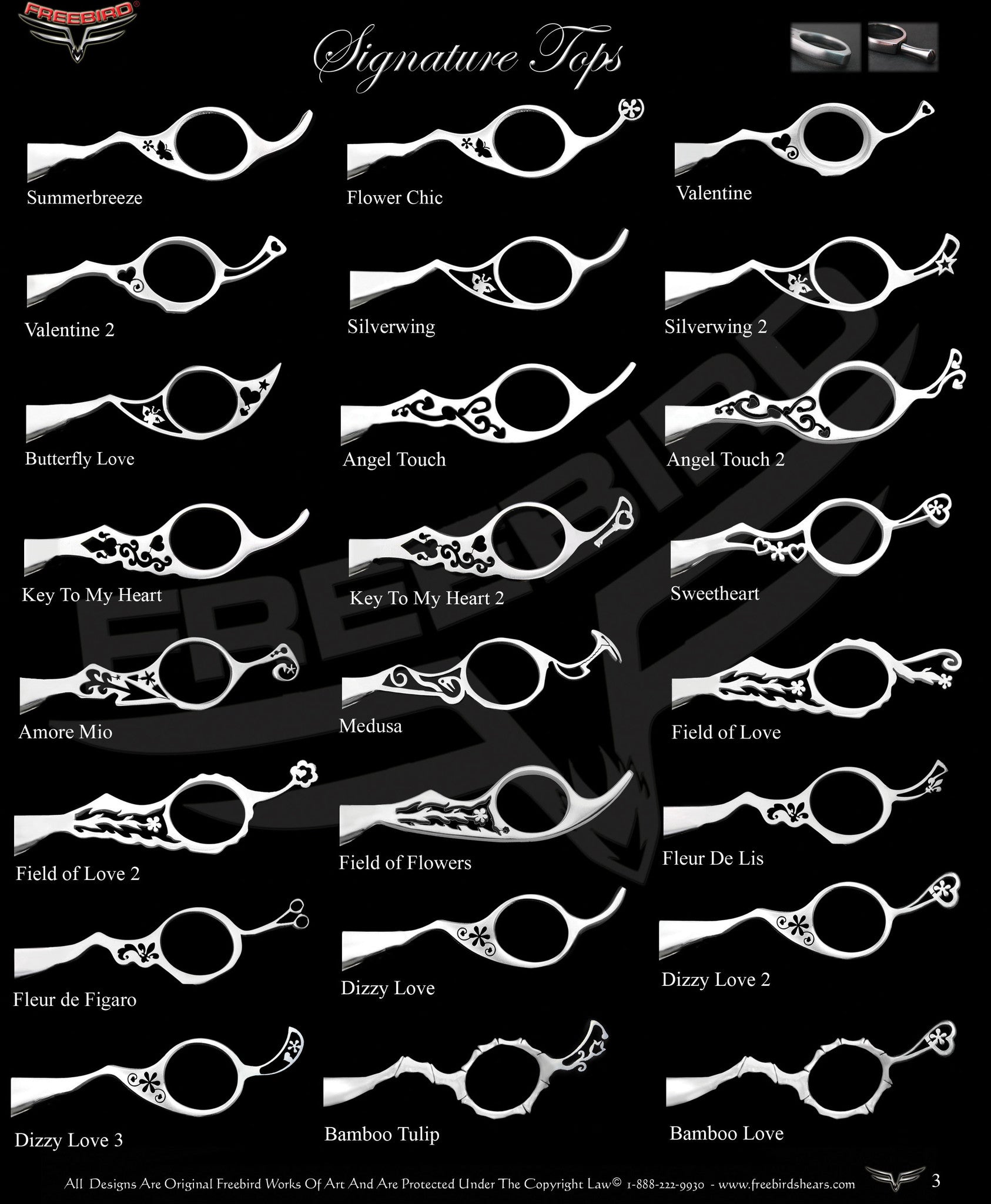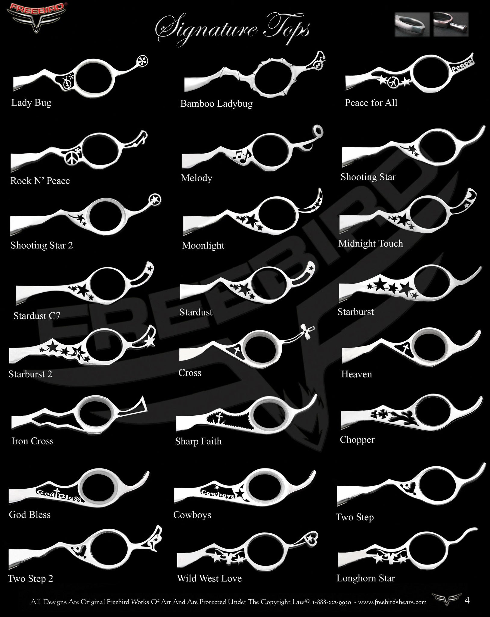Freebird Shears is the only shear company in the world that lets you build your own shears from scratch in just a few easy steps for no extra charge right here in the U.S.A. We have combined the finest Japanese and German Steels with German Craftsmanship and American Technology to bring you a new kind of quality that you will not find anywhere else. Simply choose your top and bottom handles, your shear length and shear details and we custom make a shear for you that will keep turning heads. We even have 2 types of very easy payment plans available. Owning a shear that is truly yours has never been easier. Now lets get started!