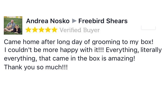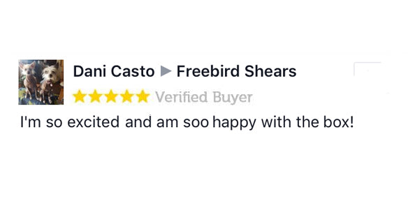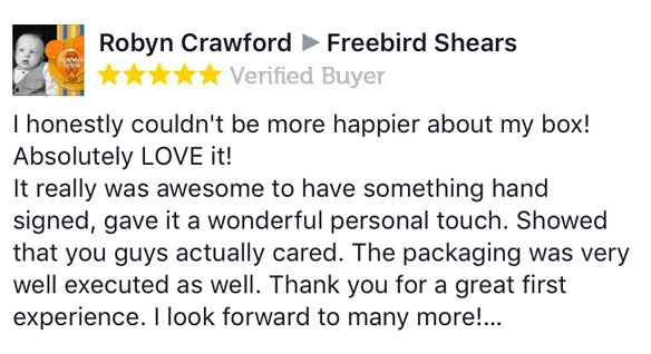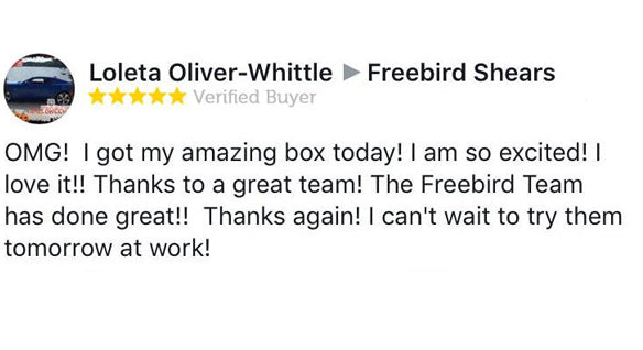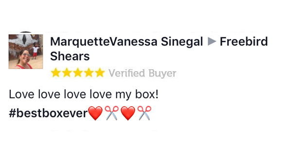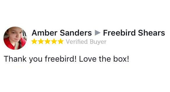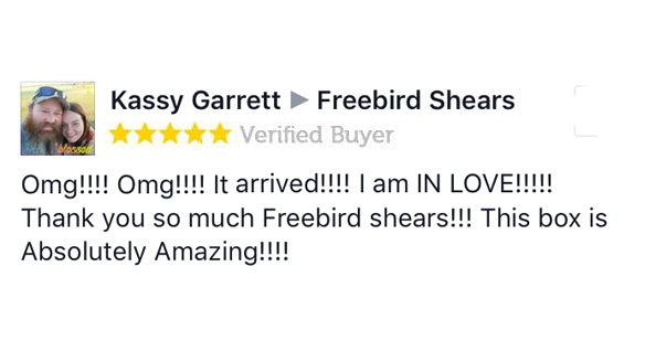 This is amazing Freebird.....thank you!!!! I was so excited when this arrived today. I used the shears immediately. I'm so impressed and can't wait for the next box. I'm wearing my new t-shirt tomorrow for work and will definitely be using the scissors. Which are great....nothing like a set of Freebird shears. My first pair of shears was Freebird 7 years ago and still use them today. Thanks so much!!!!!